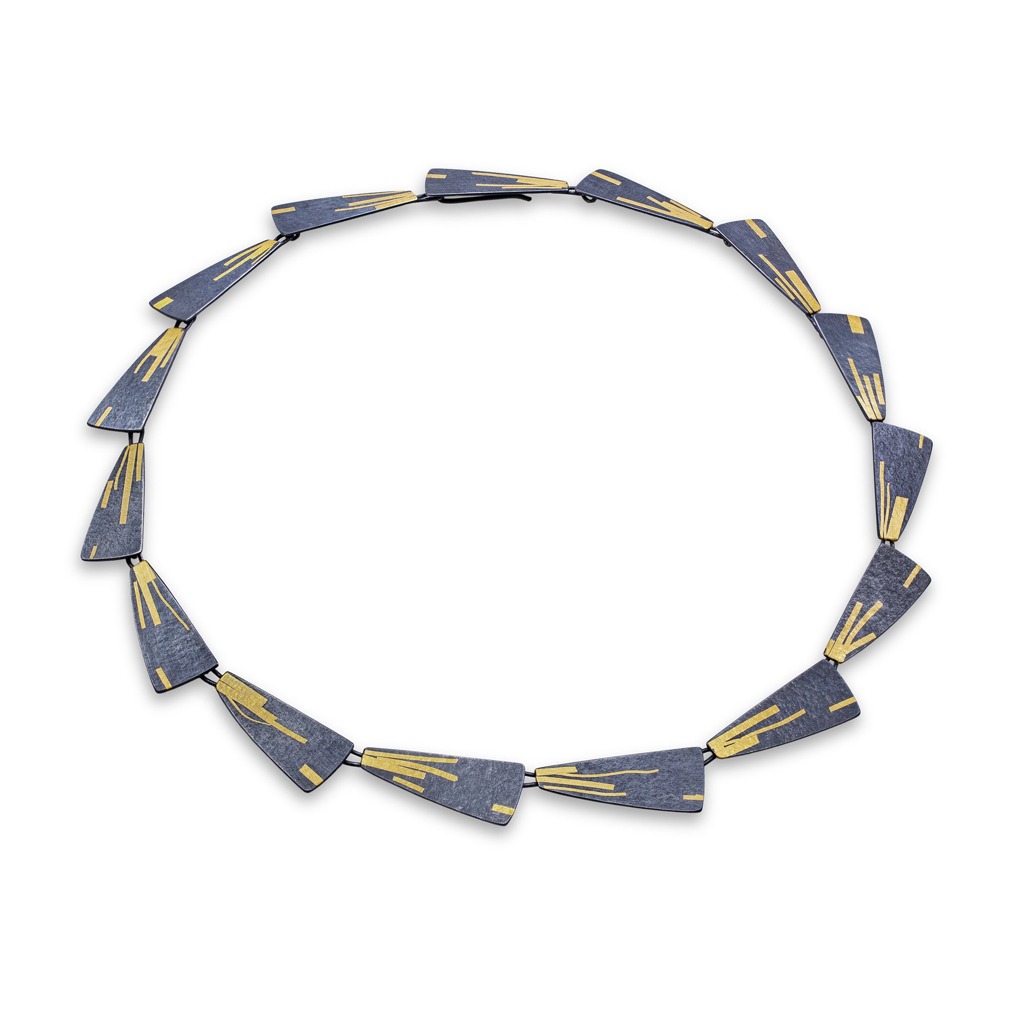 A striking necklace in oxidised silver with shimmery lines of keum boo (fused 24ct gold). It sits beautifully and is entirely handcrafted.
