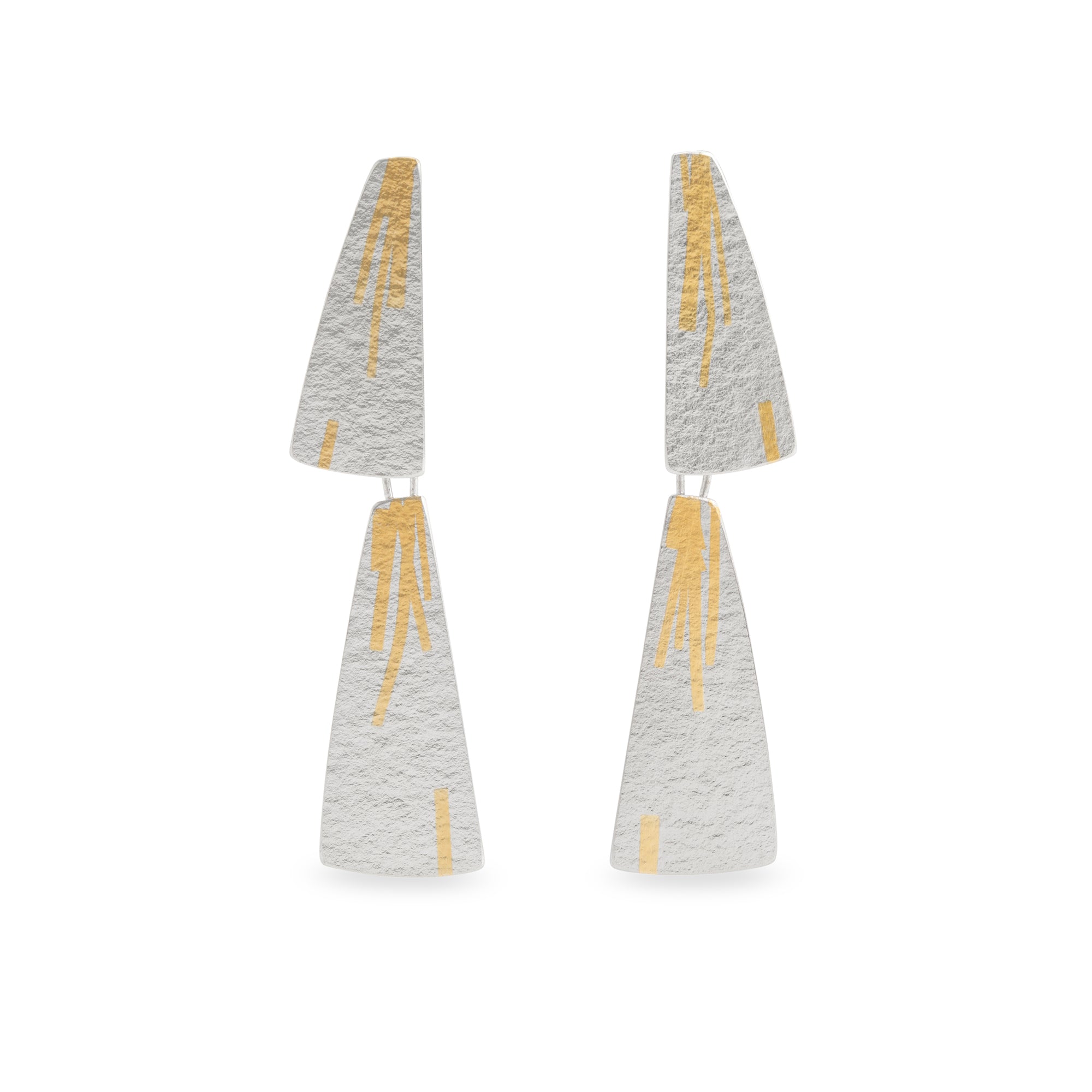 Two tier flight stud earrings in silver with unique patterns of shimmery gold lines. 24ct gold is fused (keum boo) to the surface of softly textured sterling silver.