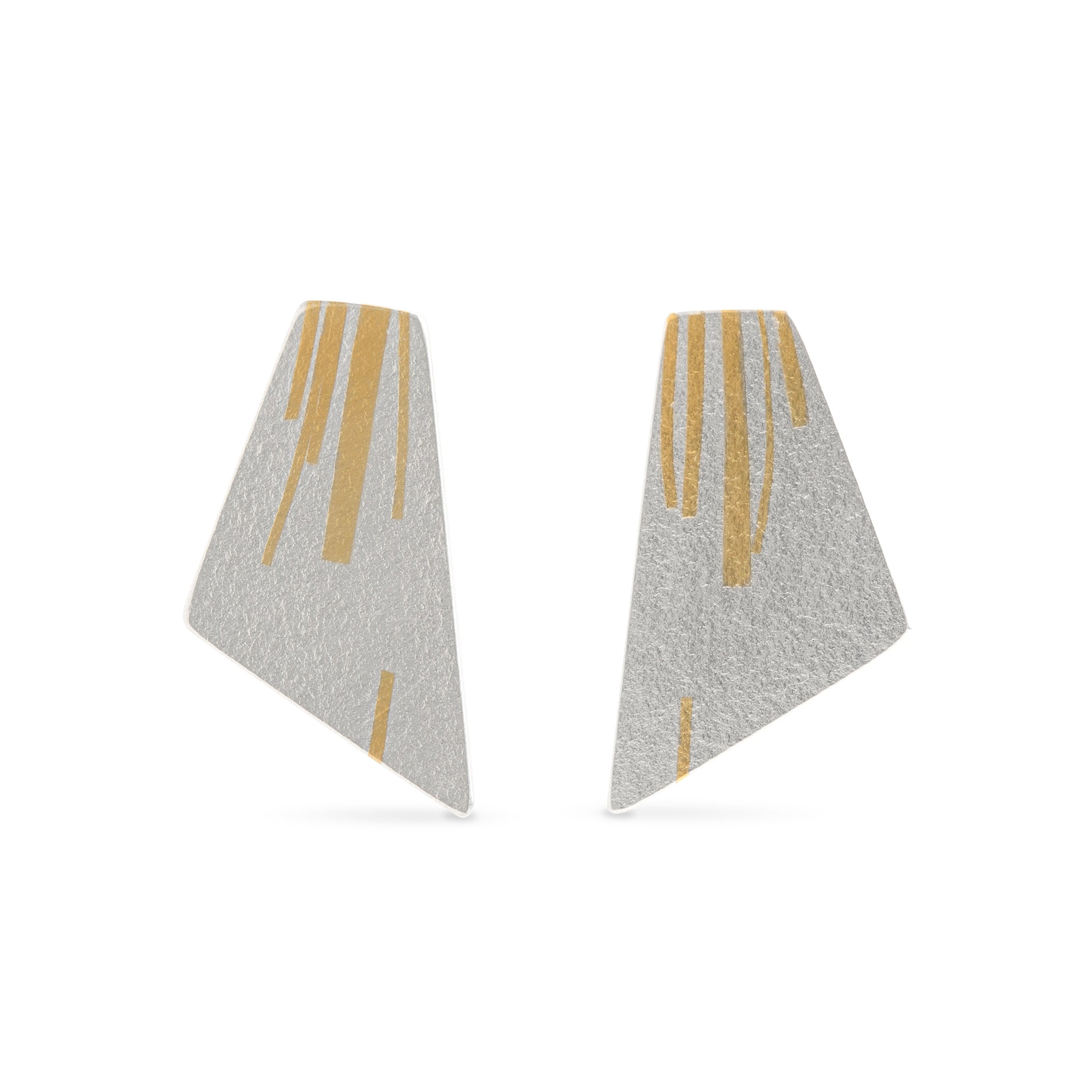 Silver earrings with unique patterns of shimmery gold lines. 24ct gold is fused (keum boo) to the surface of softly textured sterling silver.