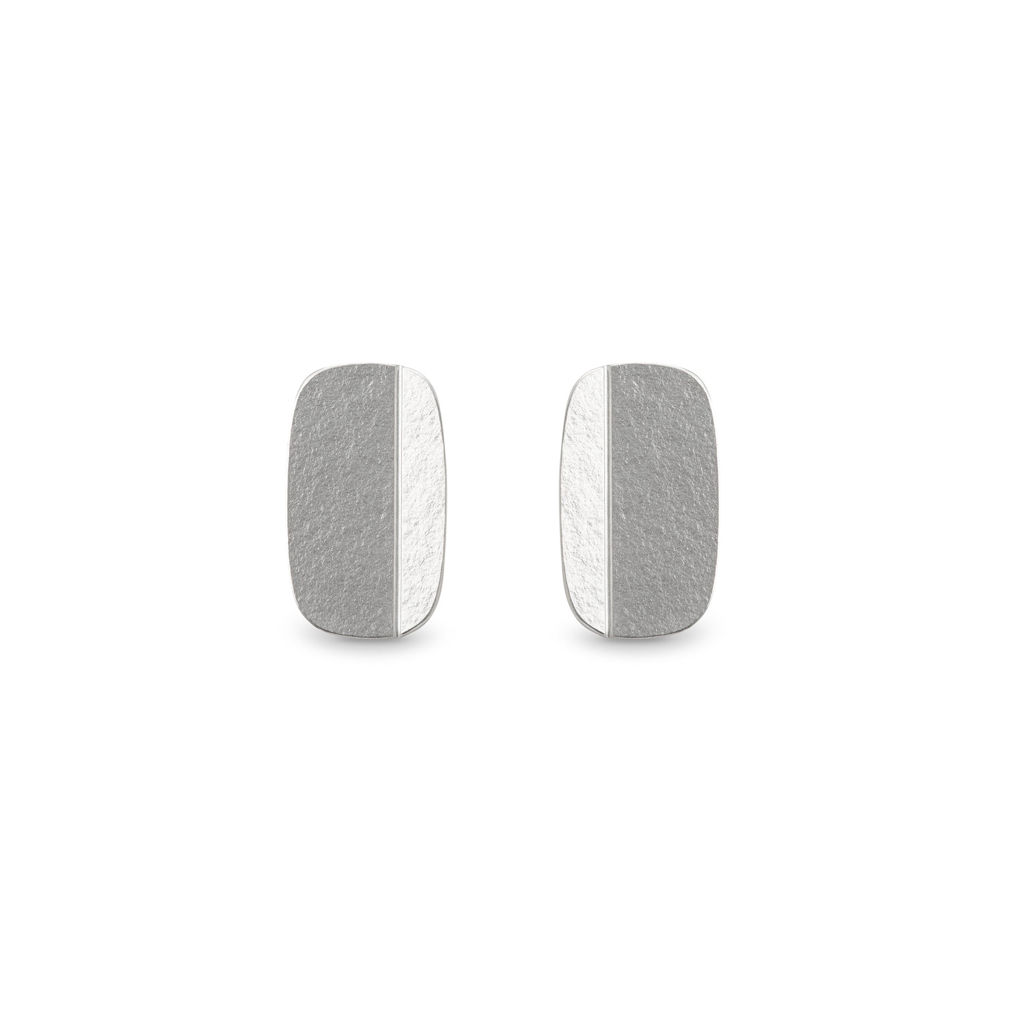 Small silver oblong stud earrings with folded details. Quietly sculptural earrings with a minimalist aesthetic.