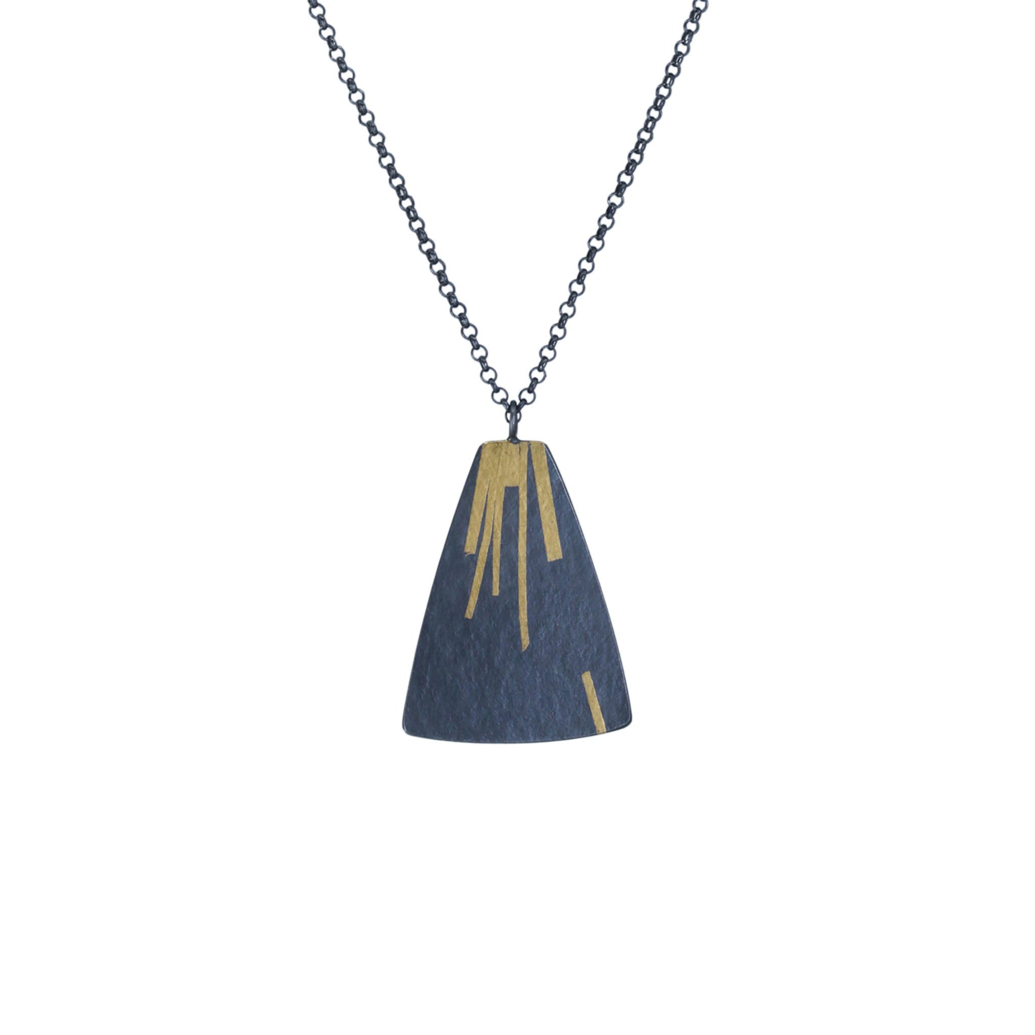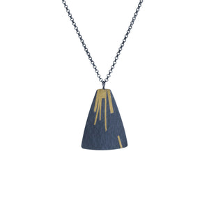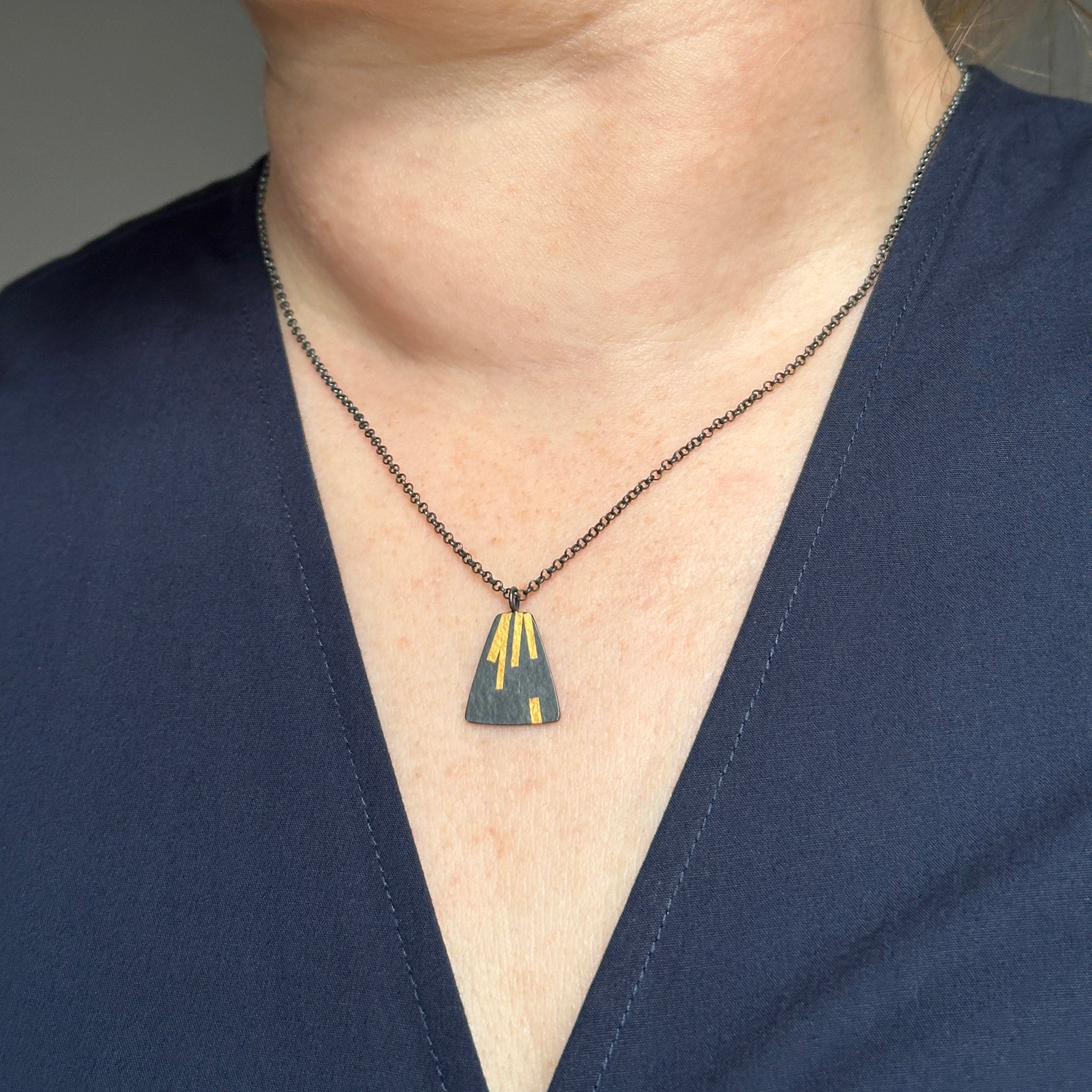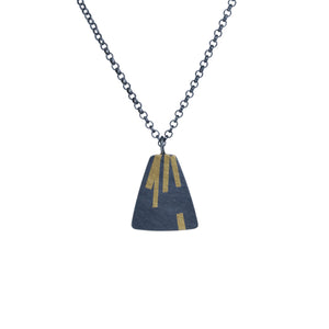 A striking oxidised silver pendant with unique patterns of shimmery gold lines. 24ct gold is fused (keum boo) to the surface of sterling silver before being oxidised to a dark grey/black finish.