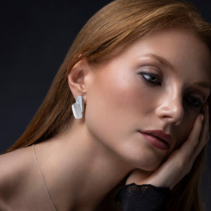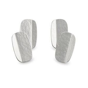 Double silver oblong stud earrings with folded details. Sculptural earrings which catch the light.