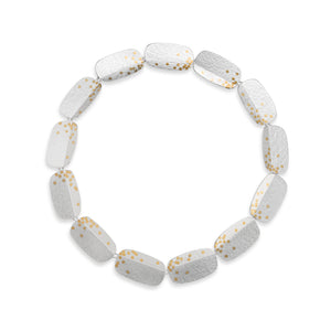 A statement necklace made of large oblongs each with a sculptural fold and a cluster of gold dots.24ct gold is fused (keum boo) to the surface of gently textured sterling silver.
