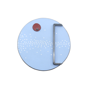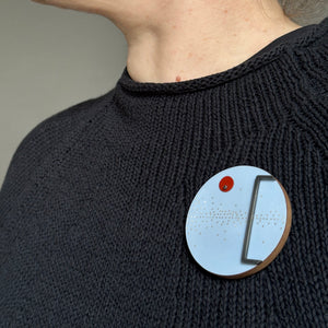 A one-of-a-kind brooch in peaceful blue laminate with inlaid silver dots and an oxidised silver frame. One paprika laminate circle detail.