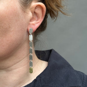 Long, elegant earrings each made with seven hand pierced oblongs in sterling silver. Shiny with a subtle irregular texture. You can choose to have last oblong in 18ct yellow gold for extra sparkle. These have great movement and swing happily from your ears.