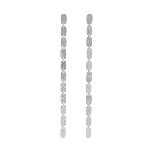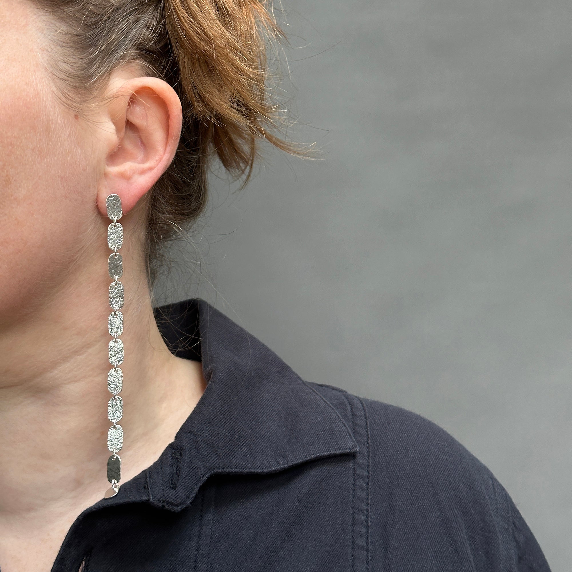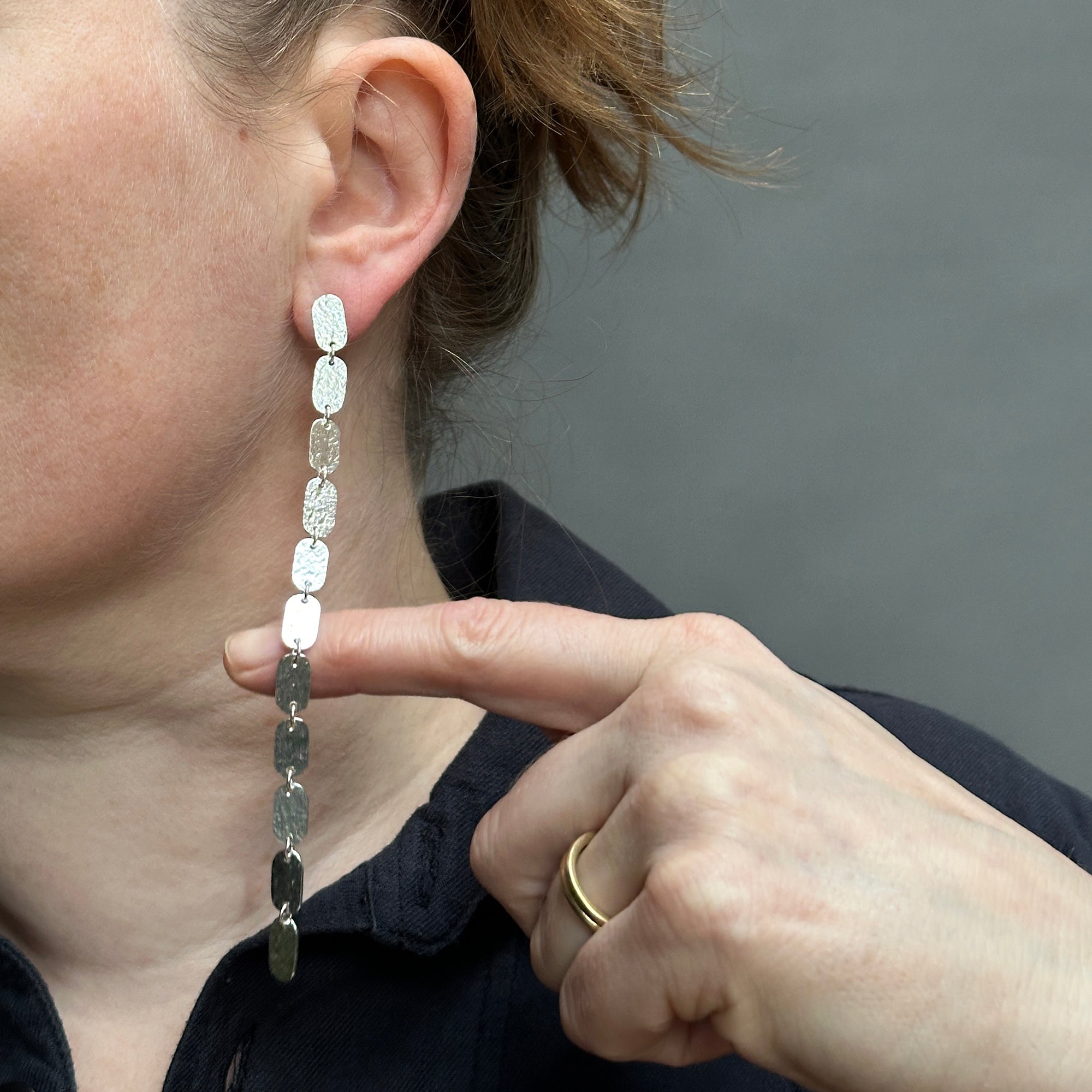 Extra long, elegant earrings each made with eleven hand pierced oblongs in sterling silver. Shiny with a subtle irregular texture. These have great movement and dance over your shoulders. The last oblongs can be in 18ct yellow gold for extra sparkle.
