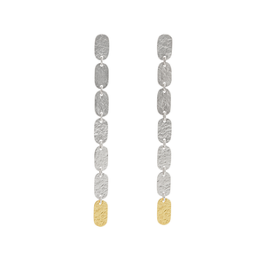 Long, elegant earrings each made with seven hand pierced oblongs in sterling silver. Shiny with a subtle irregular texture. You can choose to have last oblong in 18ct yellow gold for extra sparkle. These have great movement and swing happily from your ears.