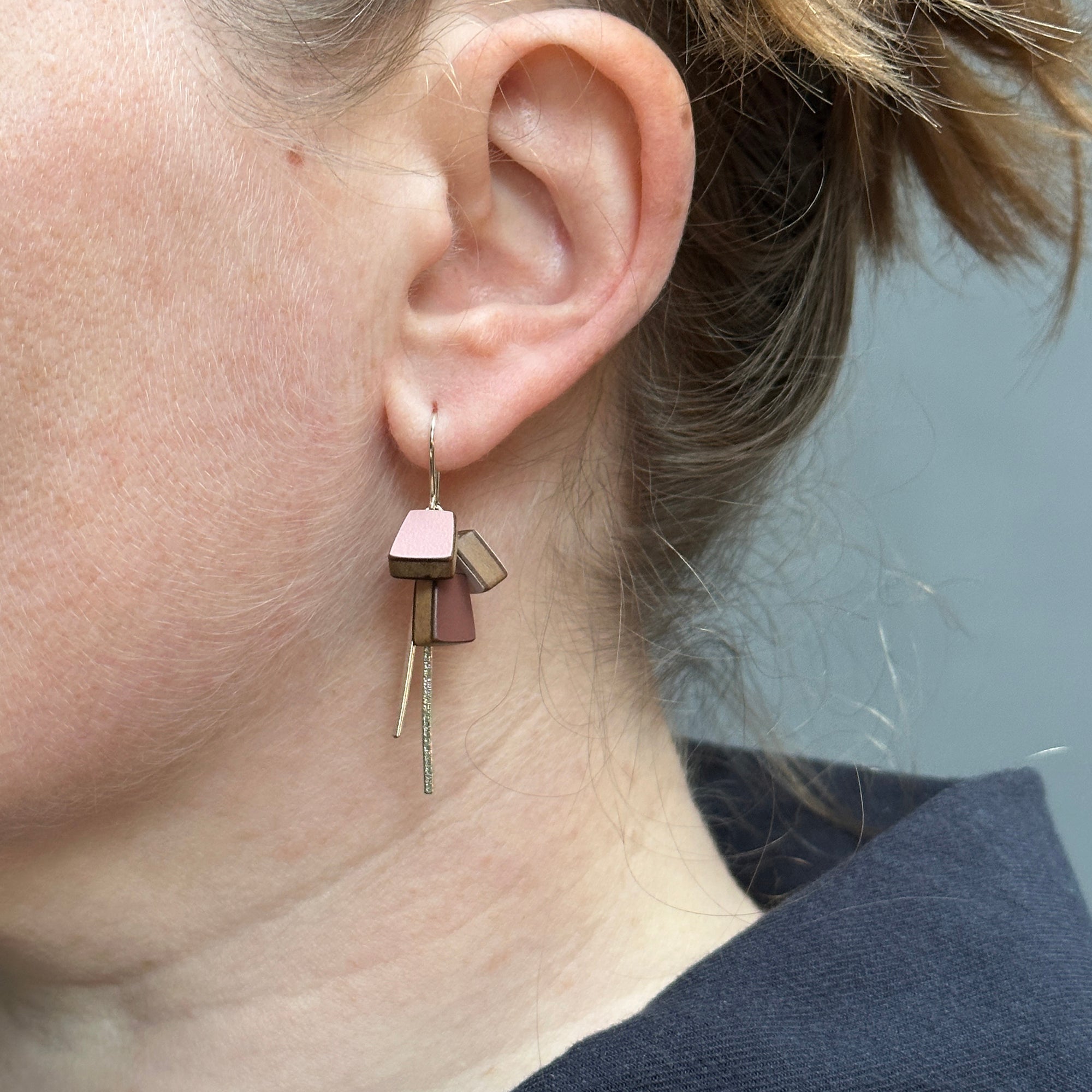 Elegant, playful earrings in sterling silver, Formica and walnut. Three handmade colourful shapes cluster around two textured silver lines. They have a lovely movement and make a gentle sound.